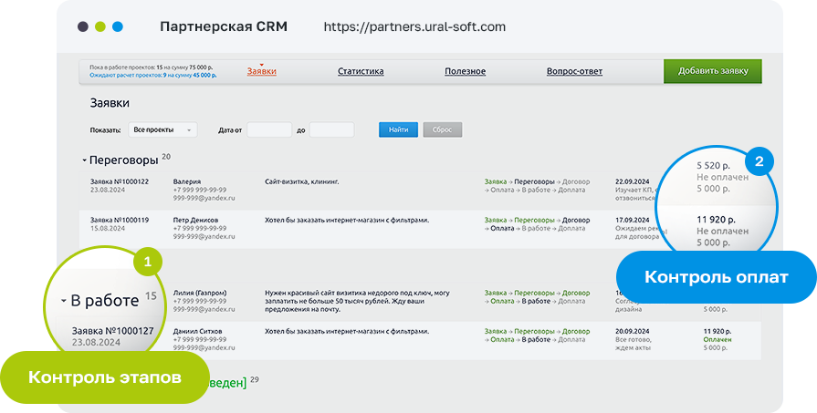Предоставляем доступ в партнерскую CRM-систему для онлайн просмотра хода переговоров и оплат по заявкам